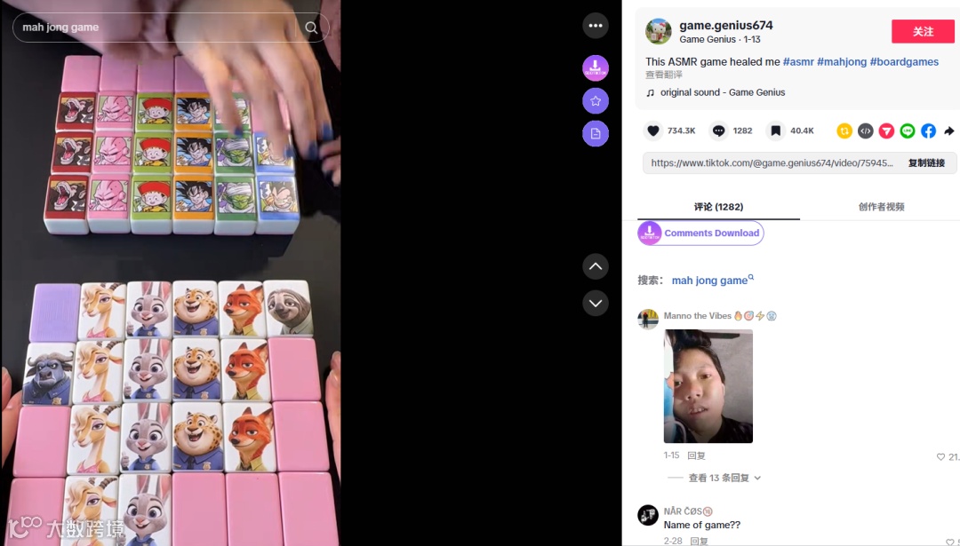 今年1月,TikTok博主@game.genius674发布一条第一视角沉浸式“麻将桌游”视频,播放量超3790万次,点赞73万+,带动账号粉丝迅速突破40万。