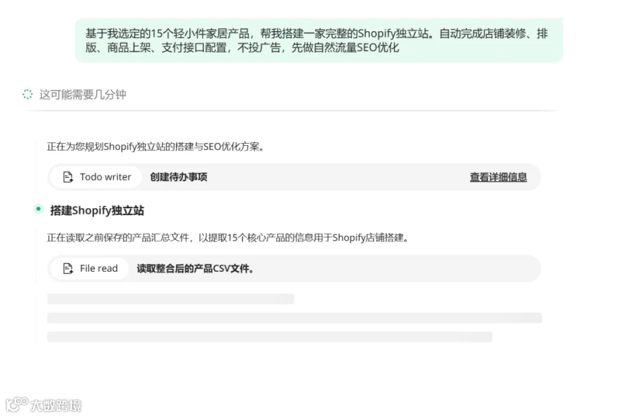 2. 发送指令后,AI会开始自主工作,你可以实时看到进度:先验证API、对接供应链,再设计店铺视觉、装修首页,最后批量上架商品、配置支付接口。
