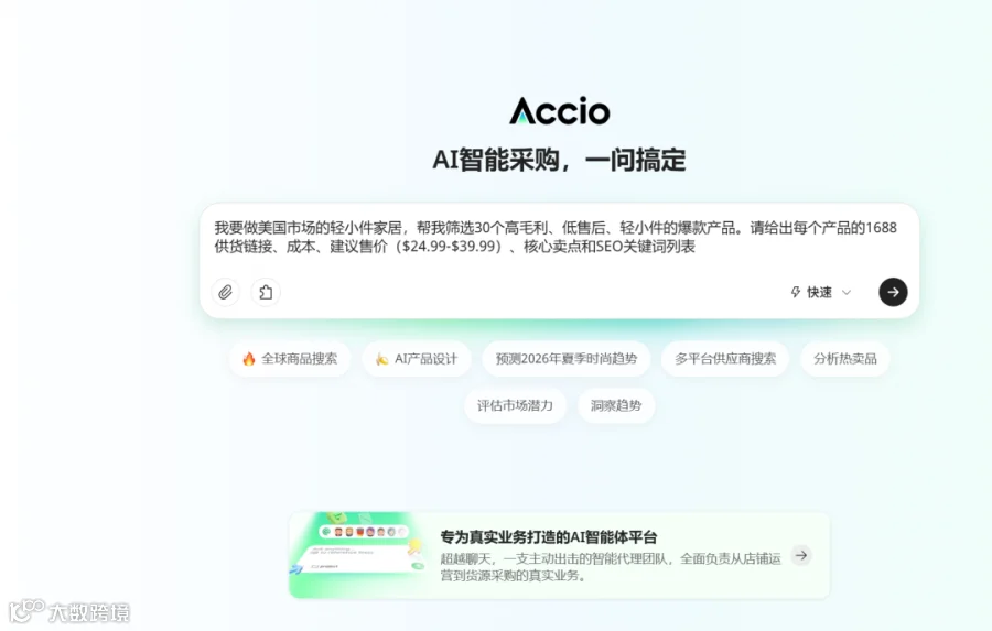 很多人看到“AI智能体”“跨境电商”就犯怵,觉得是高科技,普通人玩不转。其实真的想多了,AccioWork本质就是一个“全能电商打工仔”,还是7×24小时不休息、不抱怨的那种,你只需要下达指令,它就会帮你把所有杂活全干完。