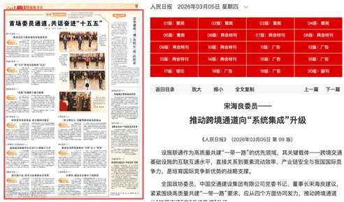 《人民日报》3月5日两会特刊刊登了各行各业代表委员的建言献策,其中宋海良建议“推动跨境通道向‘系统集成’升级”,紧紧围绕高质量共建“一带一路”要求,应从四个方面协同发力,推动跨境通道从“物理连通”向“系统集成”升级。
