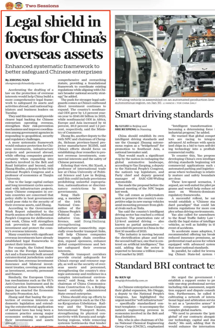 《中国建设报》3月6日“两会专题报道”刊发代表委员的两会声音。宋海良表示,在“一带一路”倡议下,我国企业出海步伐持续加快。随着投资建设规模的快速增长,现有海外综合服务难以匹配高质量“走出去”的迫切需要,在政策信息、合规服务、金融支持、标准引领、人才支撑等方面存在堵点、断点,亟须通过系统化赋能构建高水平综合服务体系,提升出海企业国际竞争力。对此,宋海良认为,相关部门应继续加大推进与引导力度,实施五大赋能提升工程,系统性赋能高水平海外综合服务体系。