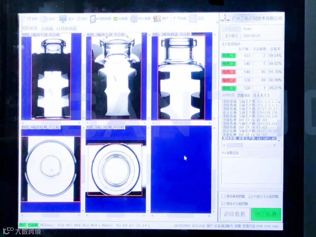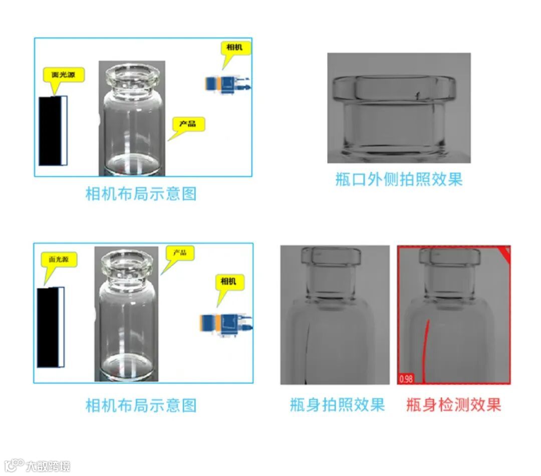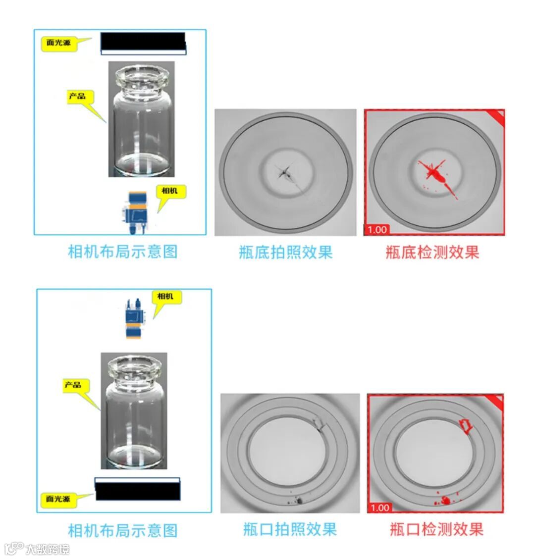 瓶身检测 → 瓶子旋转,相机360°拍摄,AI智能识别裂痕、污渍。