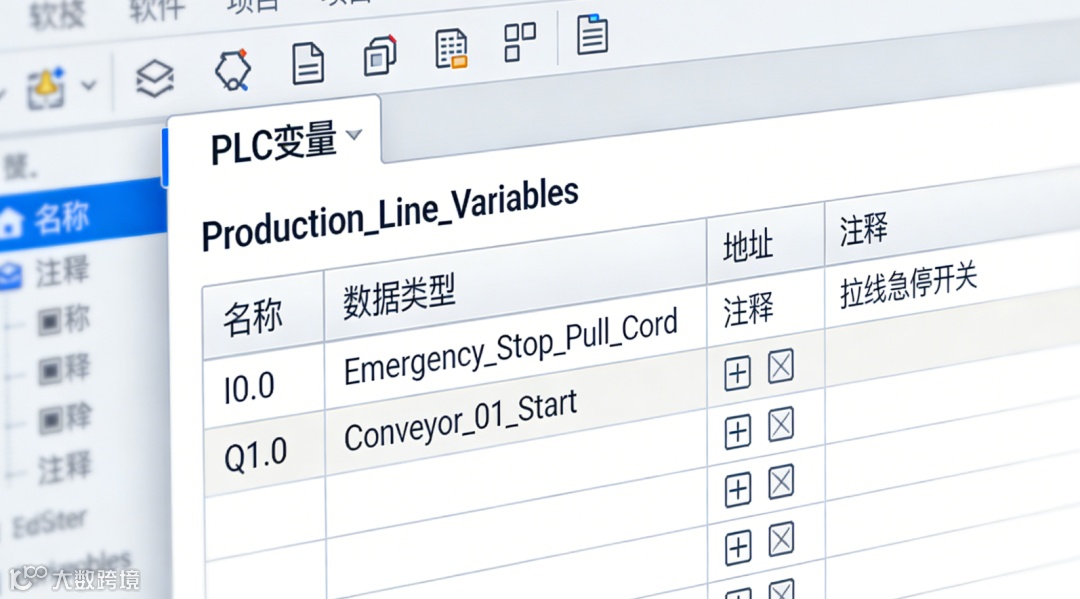 I0.0命名为Emergency_Stop_Conveyor_01。全局数据块(DB)与符号寻址:将数据封装在全局DB中,并访问其符号名。