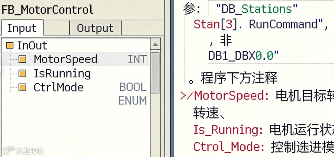 “Stations”.Station[3].Pressure_Actual,比访问DB10.DBW60清晰百倍,而且易于扩展工位数量。函数块(FB)的接口设计