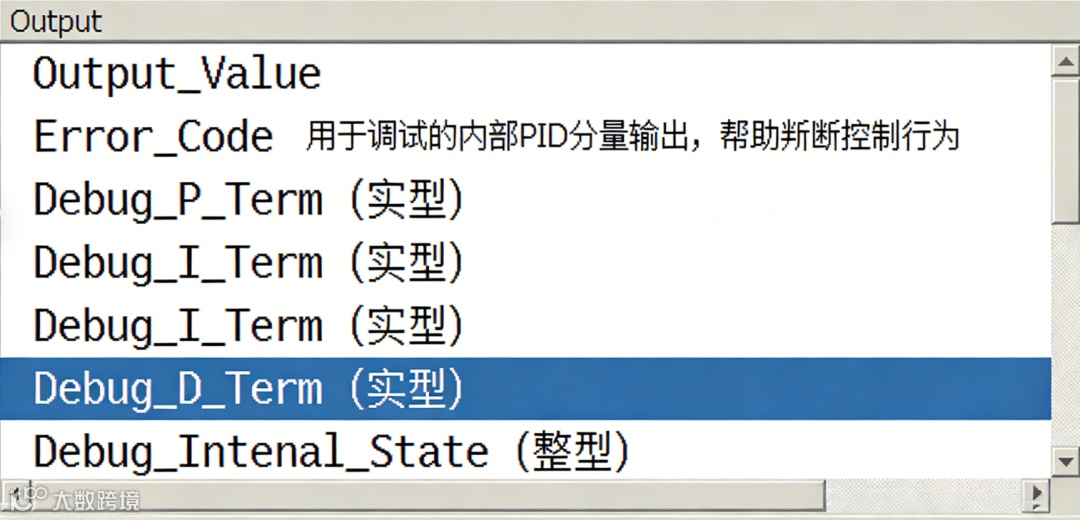 例如,将PID算法的中间计算值(P分量、I分量、D分量)作为输出参数引出。