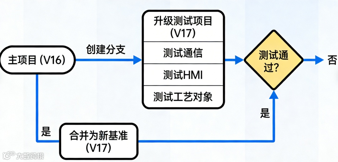升级分支:如果需要升级,创建一个项目的“分支”(副本),在副本上进行升级和测试。测试通过后,该分支成为新的基准版本。
