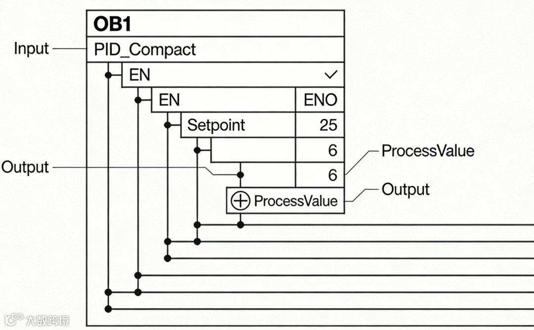 程序调用非常简洁,只需在 OB1 或定时中断 OB 中调用 PID_Compact 块,将 Enable 置 1 即可自动运行。
