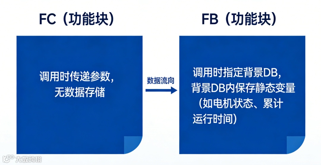 它与FC的最大区别在于拥有静态存储区——每个FB必须搭配一个背景数据块(Instance DB),用于保存FB内部的静态变量(Static)。