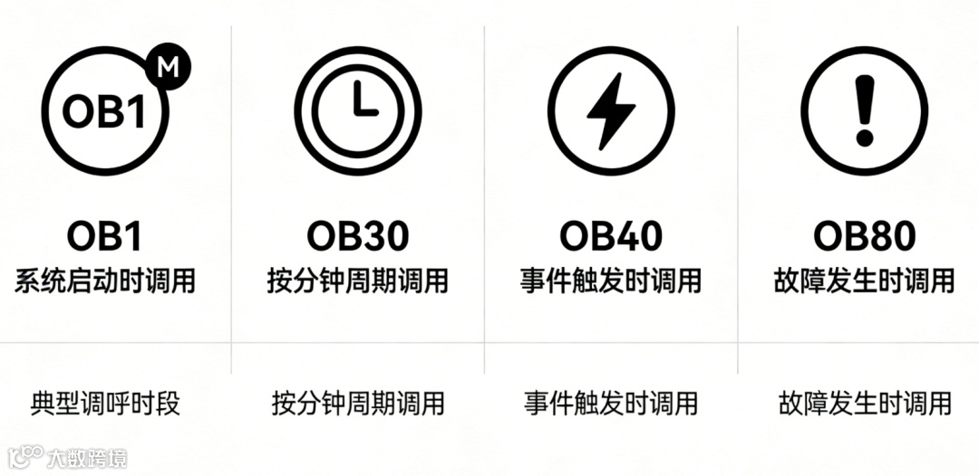 错误OB(如OB80、OB82):当PLC检测到编程错误、模块故障时自动调用,可在此编写故障处理程序。