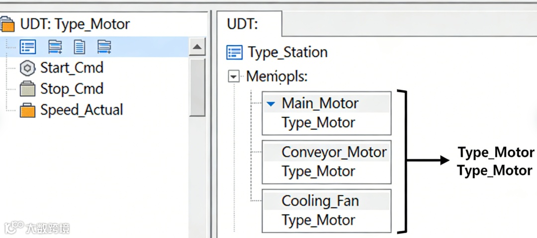定义上层类型:再定义一个“工位类型”(Type_Station),内部包含三个“电机类型”的实例: