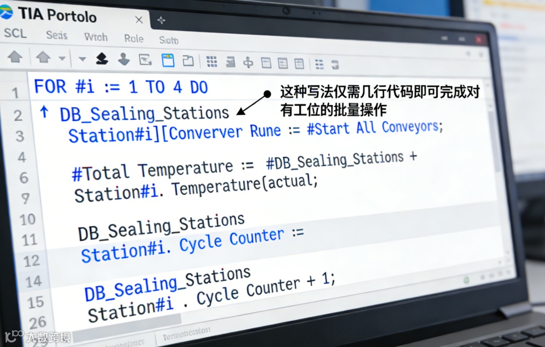代码简洁性:配合SCL或梯形图,可以使用循环指令(如