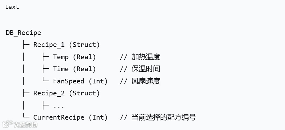 例如先创建UDT “RecipeType”,包含Temp、Time、FanSpeed。