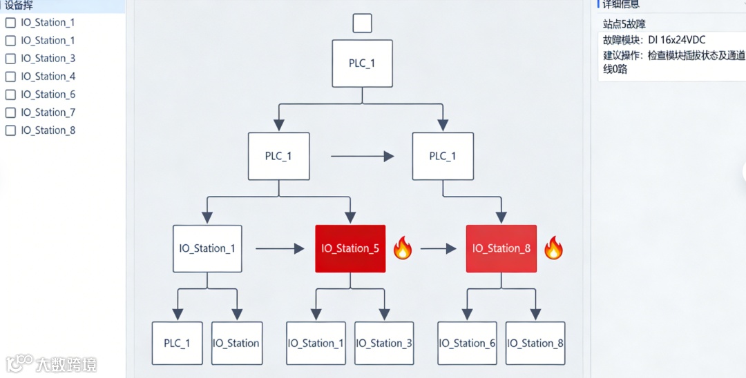 模块状态:一个树形结构展示了站点上所有模块(电源、接口模块、IO模块)。哪个模块有故障,旁边会显示红色叉号。