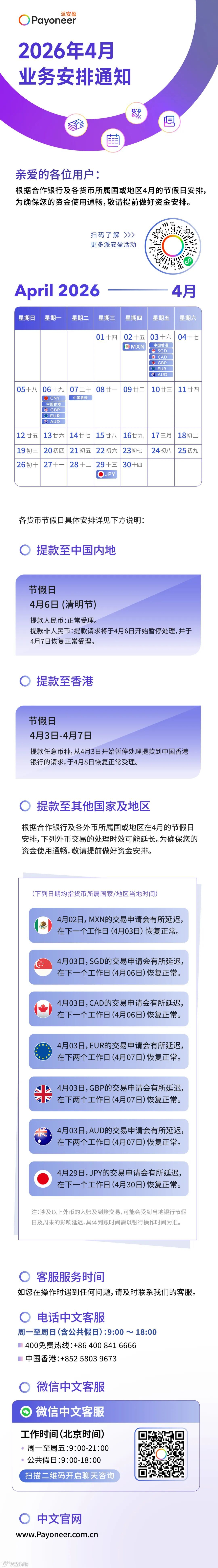 2026年清明节假期业务调整及4月业务安排通知
