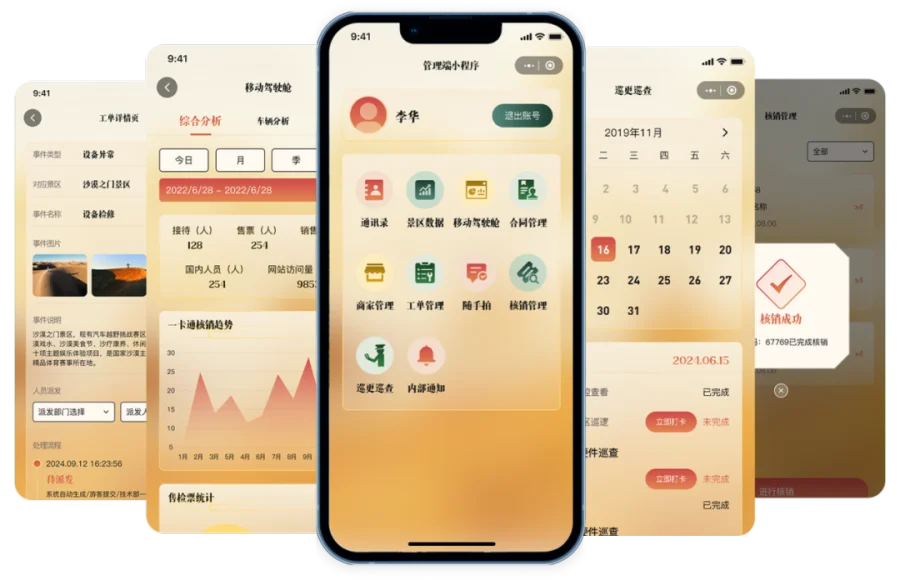 作为“一屏管”的移动端延伸,“一掌通”移动管理终端赋能一线员工,解决了传统管理中“指令传达滞后、信息反馈不畅”的痛点。该终端根据管理员、巡检员、售票员等不同角色设置分层级权限,一线人员可通过手机完成巡更打卡、设备报修、票务核销等工作,任务处理进度实时同步至后台。