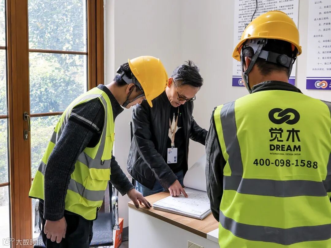 觉木团队与客户代表围站图纸前,针对空间布局、工艺细节展开深度沟通,力求将设计蓝图完美转化为实景。