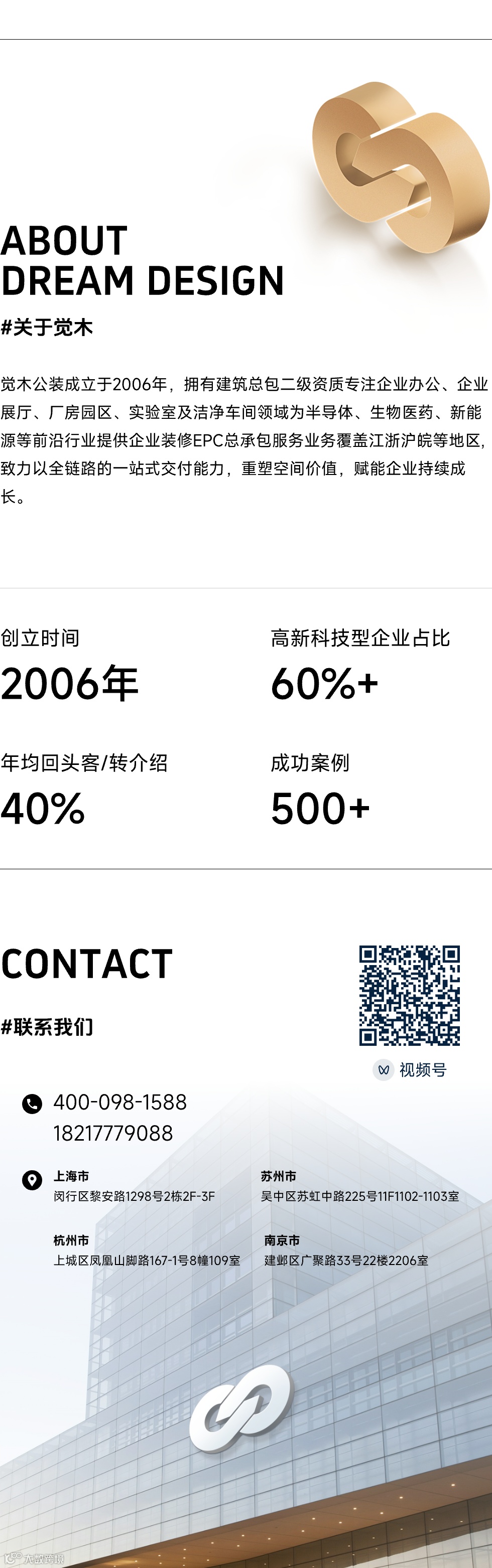 觉木公装(上海觉木装饰设计工程有限公司)总部位于上海,服务网络覆盖江浙沪皖。公司专注于为科技型企业提供总部办公、研发实验室、洁净车间、智能厂房及企业展厅等空间的整体解决方案,致力于通过设计赋能企业,重塑空间价值。