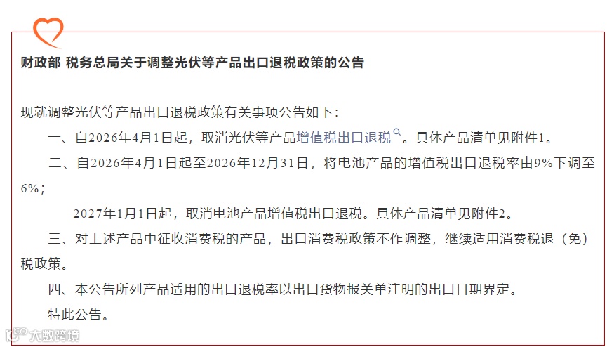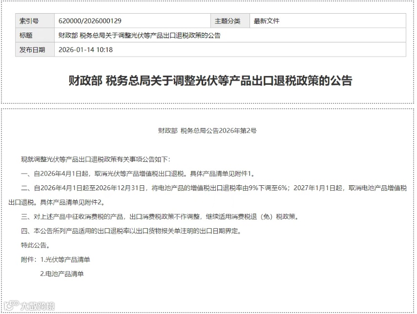 近期,财政部会同税务总局发布了公告,明确了自2026年4月1日起,取消光伏、磷化工等产品的出口退税,并分两年取消电池产品出口退税。