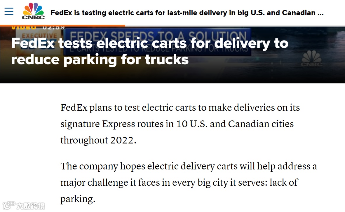 CNBC报道,联邦快递公司今年3月计划在美国和加拿大的10个城市测试电动车送货,以解决停车位不足的问题。