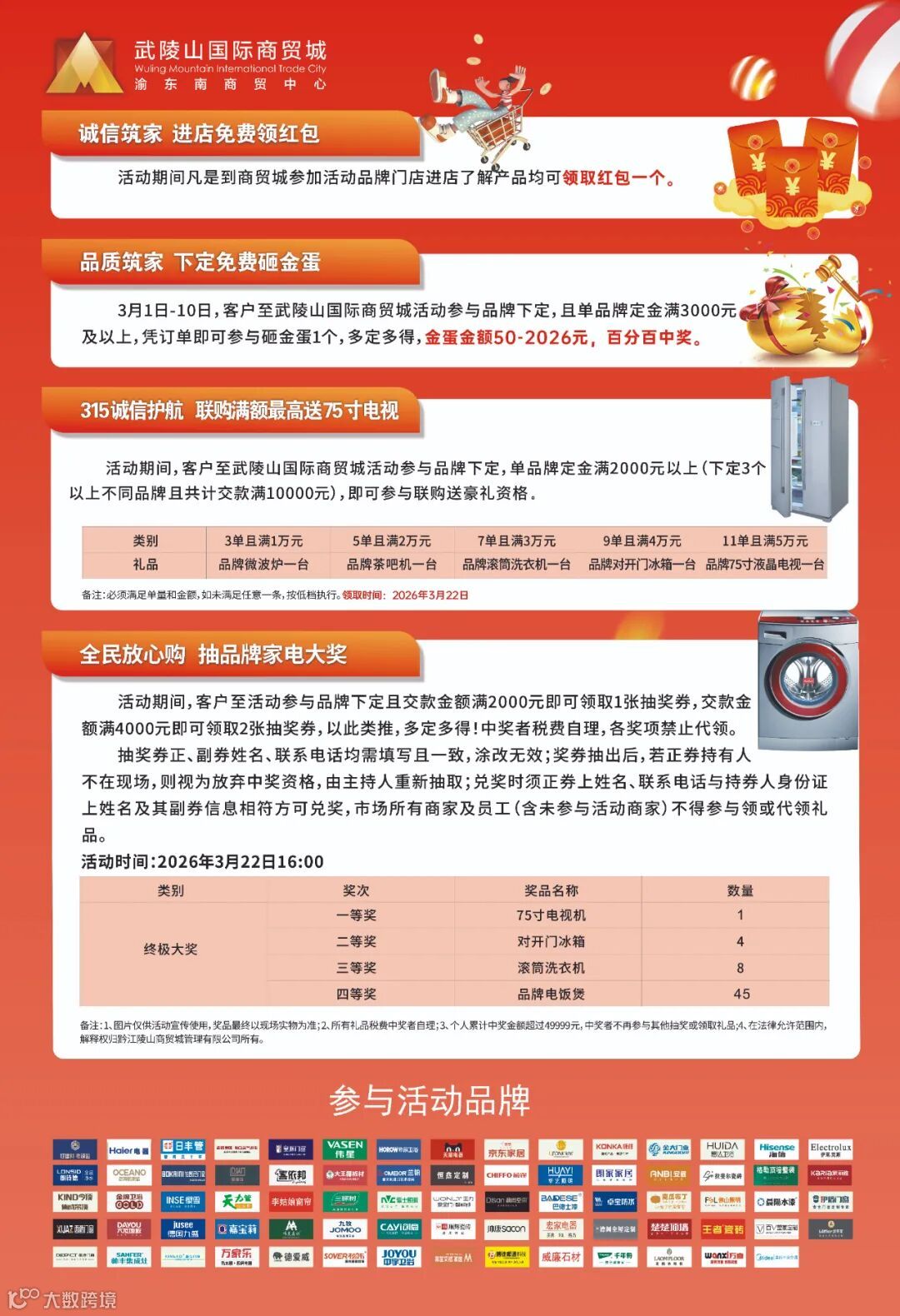 3月1日-10日,客户至武陵山国际商贸城活动参与品牌下定, 且单品牌定金满3000元及以上,凭订单即可参与砸金蛋1个,多定多得,金蛋金额50-2026元,百分百中奖。