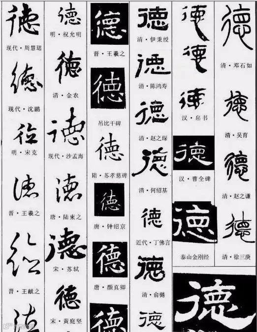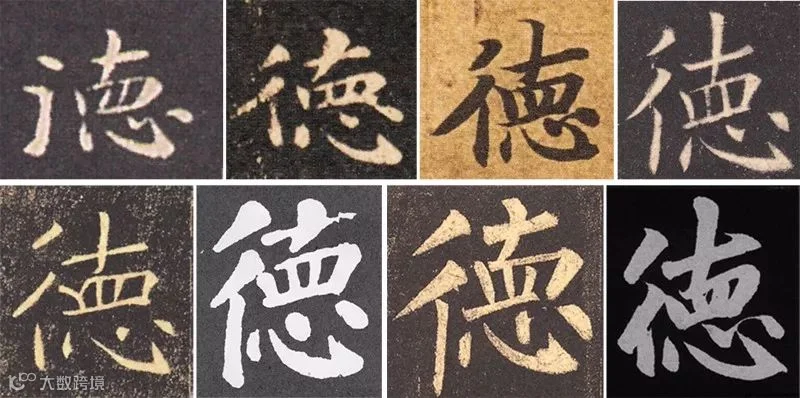 “德”字依次为钟繇、王羲之、智永、欧阳询、褚遂良、颜真卿、柳公权、赵孟頫。