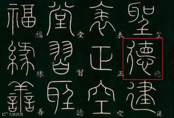 李阳冰这个“小动作”,可视作“始作俑者”,不久书法家史惟则在《荐福寺碑》中,“德”字也加了一横。于是,中唐时期,篆书中出现了 “德”字加了一横的写法,只是书法中出现标新的异体,在典章文献中并不通用,如唐碑《郭府君墓志碑》,字体为楷书,写“大唐武德七年”,“德”字中无一横,可认为这是唐代通行文字书写的范例。