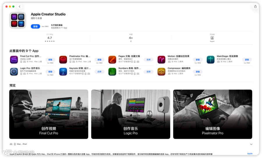 Apple Creator Studio 的核心优势之一的是“一站式整合”,无需单独下载、购买多款工具,订阅后可直接获取全套核心应用及增值功能,具体包含两类核心模块: