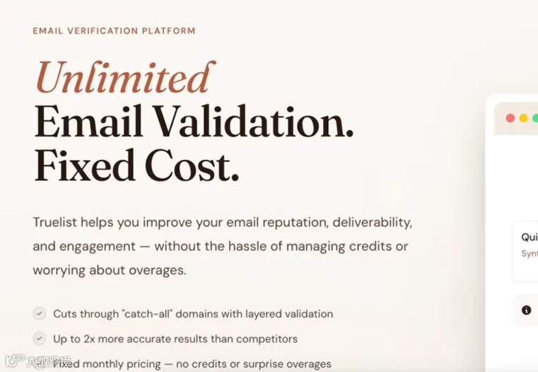 邮箱验证API,这个做起来特别简单,用户传个邮箱地址,你返回能不能送达的状态,所有做 outreach、发冷邮件的代理都要用到,完全可以做一个。已经有公司靠这个赚几百万了,用户传个公司域名比如apple.com,你返回公司员工列表和对应的邮箱,Zoom Info就靠这个赚了几亿,市值几十亿,还在纳斯达克上市了。