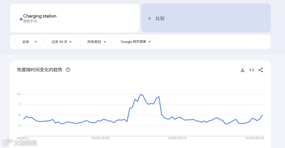 谷歌趋势显示,"Charging station"全球搜索热度持续处于高位。2025年全球充电桩市场规模预计达48.7亿美元,将以41.42%年复合增长率攀升至2034年1102.5亿美元,快充需求激增。