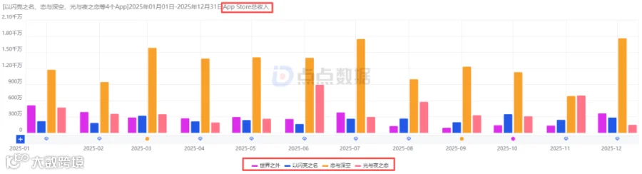 2025年《以闪亮之名》《恋与深空》《世界之外》《光与夜之恋》国服iOS端月流水趋势