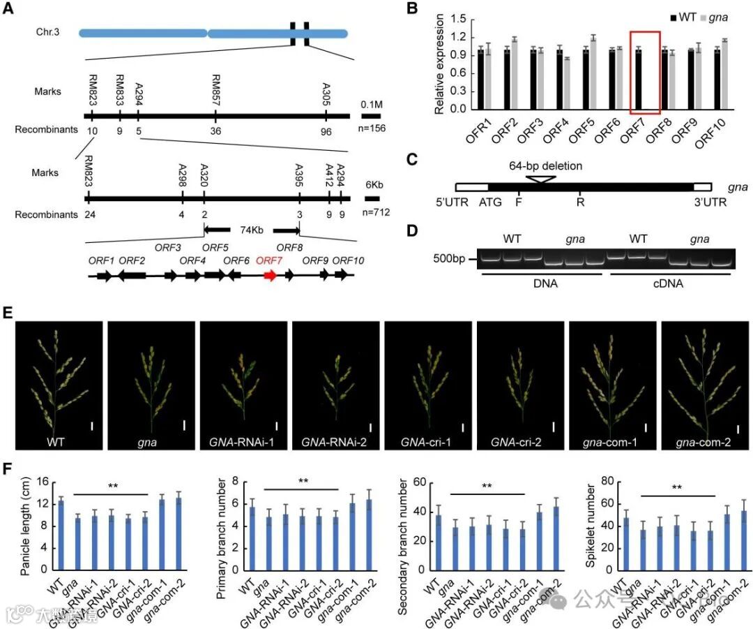 通过gna与IRAT129杂交F2群体进行图位克隆,将GNA定位于3号染色体74 kb区间内,包含10个ORF。RT-qPCR和测序分析确定ORF7(LOC_Os03g51330)为候选基因,其起始密码子附近存在64 bp缺失。利用CRISPR/Cas9和RNAi敲除该基因后,转基因植株重现gna表型;互补实验恢复野生型表型,证实GNA即为ORF7(图2)。