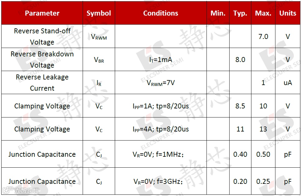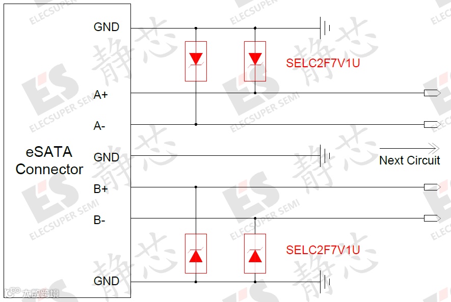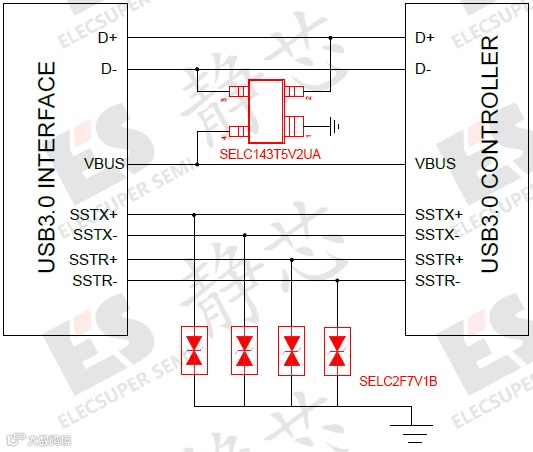 SELC2F7V1B为双向器件,拥有低至0.25pF的超低电容,对高速信号的衰减很小,能最大程度地保证信号完整性,常用于保护数据传输速率极高、对信号质量非常敏感的差分信号线,例如USB 3.1 / 3.0、HDMI 2.0 / 1.4、DisplayPort 和 Thunderbolt等高速接口。