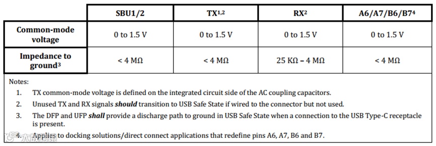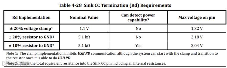 Sink 端:CC 引脚悬空或Sink端的CC引脚通过电阻 Rd下拉至 GND(0V)。
