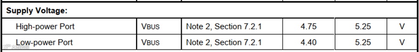 在USB 2.0规范中表明,VBUS引脚上的电压为5V±5%。因 USB 3.0及更高规范可向下兼容,在不带有 USB Power Delivery(PD)协议 的USB芯片上,其VBUS引脚上的电压为也同样遵循USB 2.0规范。