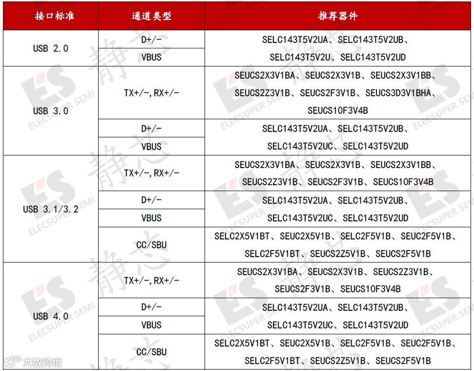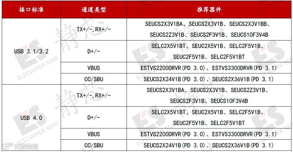 综合以上考量,我们从是否支持PD协议两个角度为USB接口推荐了一些低电容低钳位电压且没有闩锁风险的ESD防护器件,可确保信号的完整性。