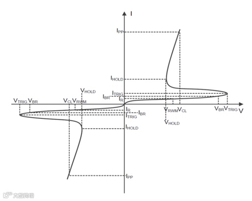 常规型ESD的电压会随着IPP(峰值脉冲电流)的增加而等比例增加,呈现出一个较为线性的增长趋势。深回扫型ESD器件在当电压达到VT(触发电压)后会瞬间将两端电压拉低,进入一个小于工作电压VRWM的较低电压VHOLD,之后随着电流的增加电压逐渐增大,如图10所示;浅回扫型ESD器件在当电压达到VT(触发电压)后会瞬间将两端电压拉低,进入一个稍大于工作电压VRWM的电压VHOLD,之后随着电流的增加电压逐渐增大,如图11所示。