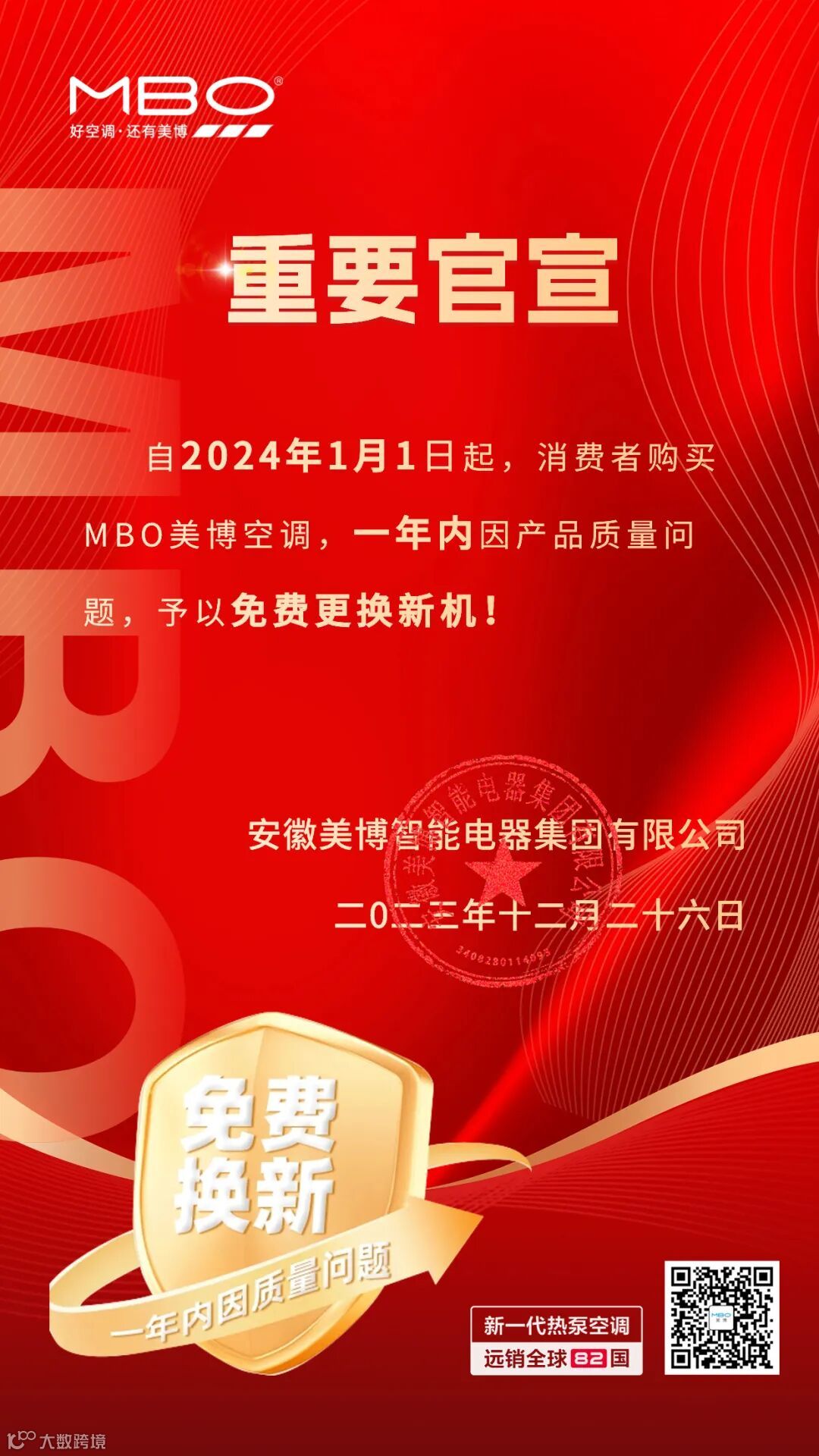 在品质为王的时代,服务成为空调企业的新赛点。12月26日,美博空调官宣了全新售后政策——自2024年1月1日起,消费者购买MBO美博空调,一年内因产品质量问题,予以免费更换新机。