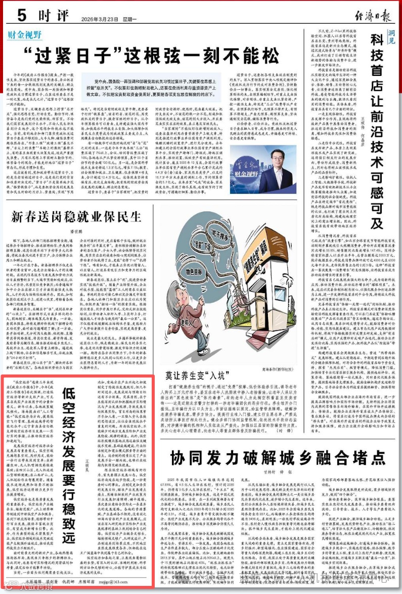 经济日报发布《低空经济发展要行稳致远》评论文章,深入解读政府工作报告“打造低空经济等新兴支柱产业”部署,指出低空经济是产业链条长、辐射范围广、拉动就业能力强的高质量发展新增长引擎。同时强调产业尚处起步阶段,各地需摒弃急功近利思维,立足资源禀赋科学谋划差异化发展路径。