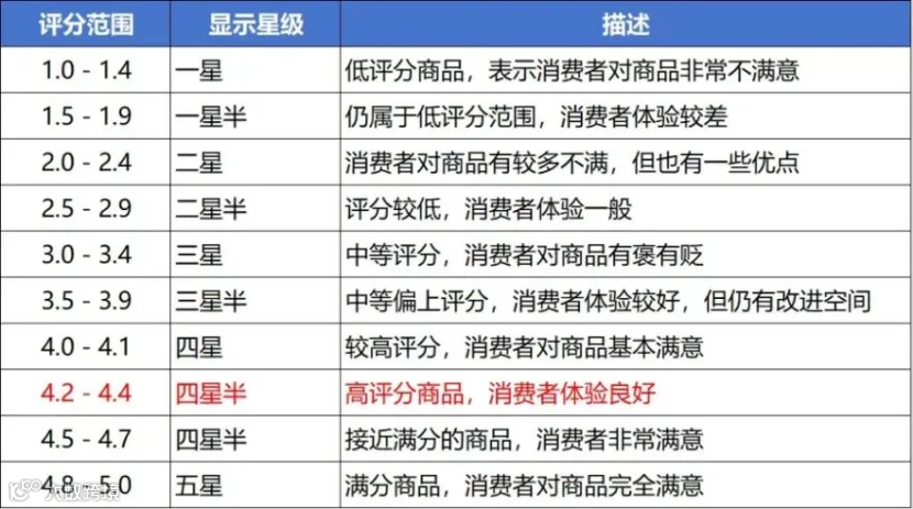 重点关注小数点后两位数值:例如前台4.5星商品后台可能为4.54或4.45,据此可筛选接近4.45、4.35等临界值的商品重点优化。