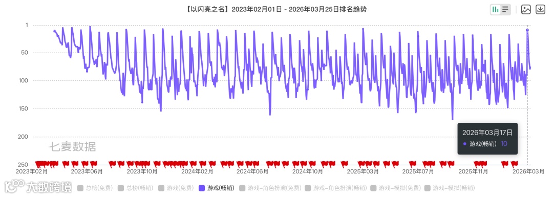 另一个拳头产品《以闪亮之名》是女性向品类近年的爆款之一。自2023年3月上线中国大陆市场以来,游戏百余次跻身iOS游戏畅销榜Top30,十五次冲入iOS游戏畅销榜Top10。