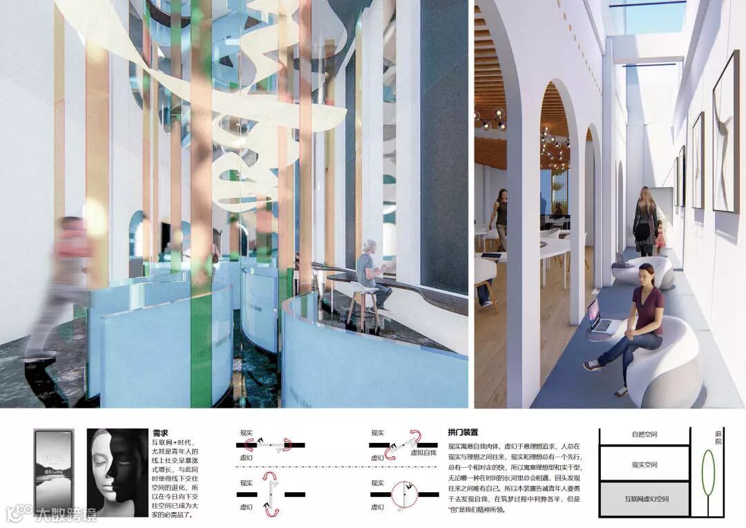 设计师以互联网的虚拟与现实为理念,通过内外融合、虚实对比的手法,塑造出丰富的空间场景,同时也形成良好的视觉反差。