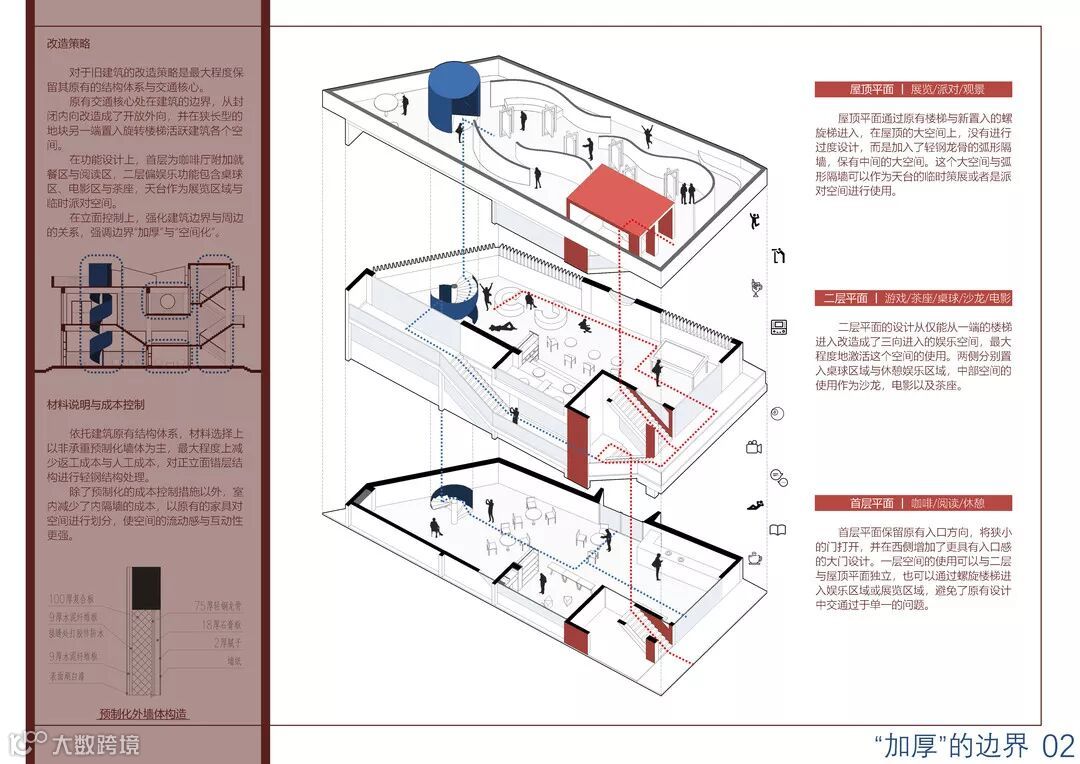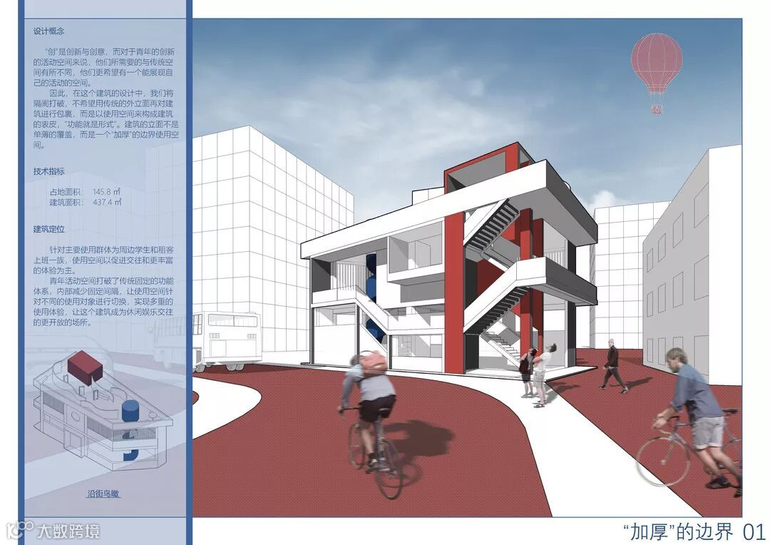 评审阶段第一眼看到作品“加厚的边界”时,正如它的作品名字,已然让人惊觉十分edgy,在众多作品中,它充满了前卫果敢的设计力,甚为突出。现在回头再重新审阅,依然对于该作品中敢于打破建筑室内外边界、置入第二交通核心筒同时赋予它最大化的空间记忆点这种种的尝试深感触动,在我看来它可以充分发挥未来该空间片区的社交核心作用,同时成为一个不可错过的场地“打卡点”,创造出属于项目自己的“边界”。
