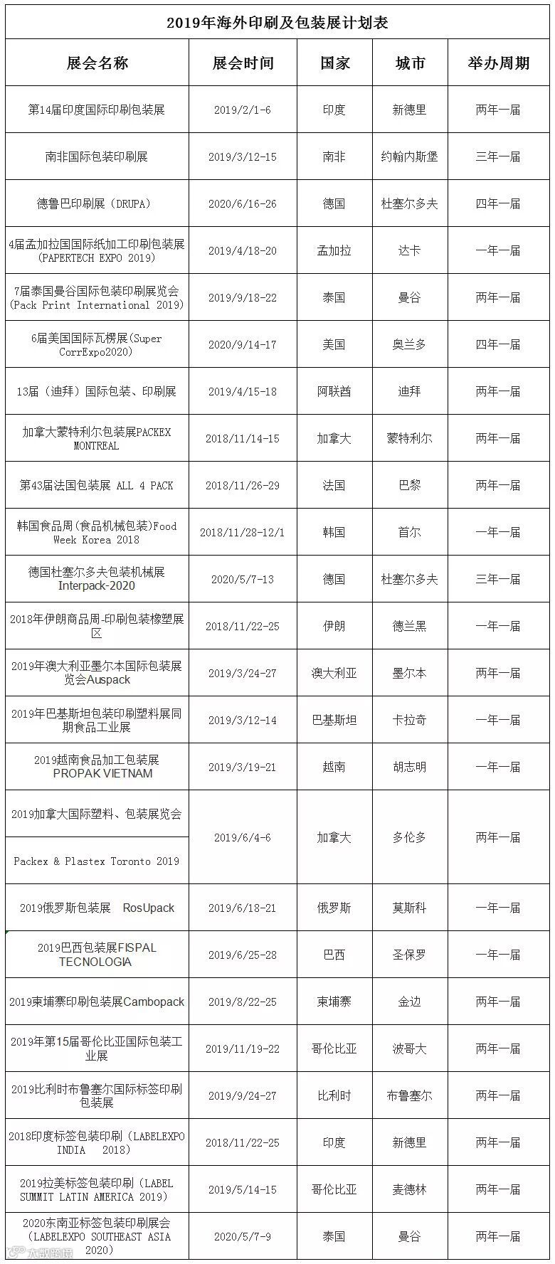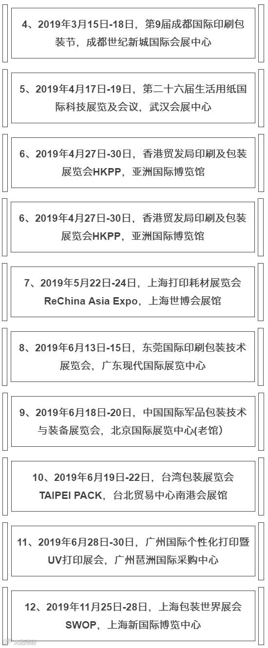 那么,2019年又有哪些重量级的印刷包装盛会呢?一起来看一下。