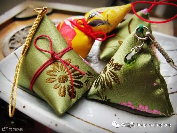 佩香囊: 端午节小孩佩香囊,传说有避邪驱瘟之意,实际是用于襟头点缀装饰。香囊内有朱砂、雄黄、香药,外包以丝布,清香四溢,再以五色丝线弦扣成索,作各种不同形状,结成一串,形形色色,玲珑可爱。