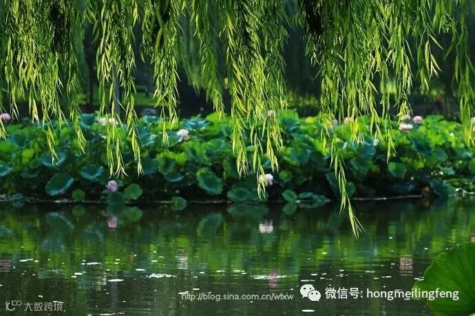 荷塘月影白, 弱柳叶随风。 花开自成景, 莫问胭脂红。