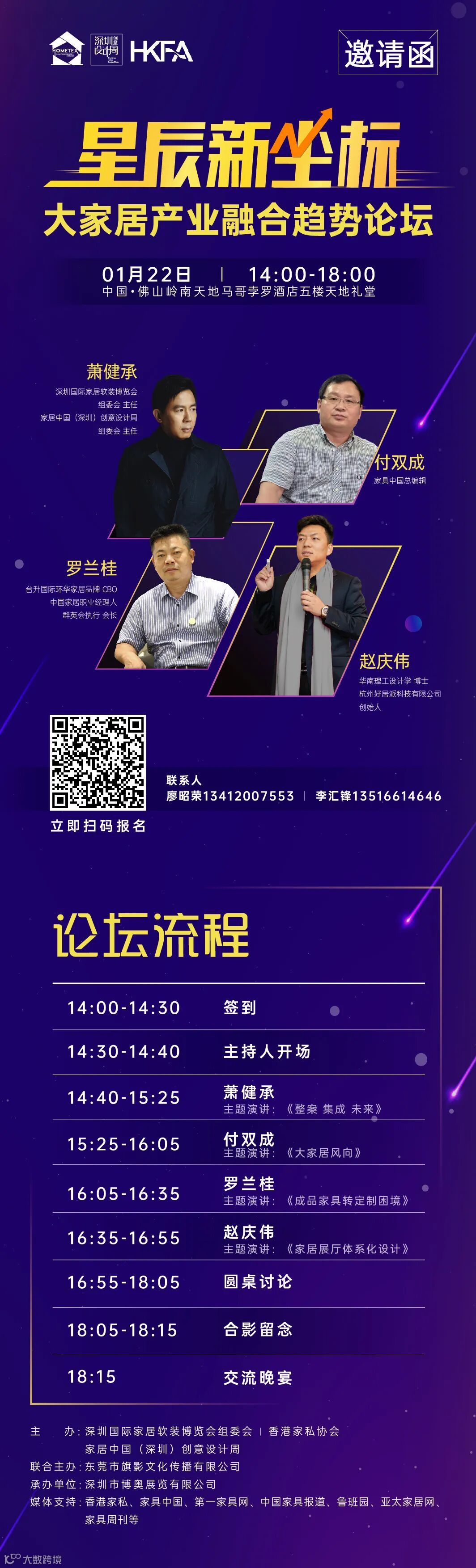 1月22日,主题为“星辰新坐标”的大家居产业融合趋势论坛将在中国·佛山岭南天地马哥孛罗酒店举行。届时将大咖云集,谈天论道,为家居行业发展指点迷津。