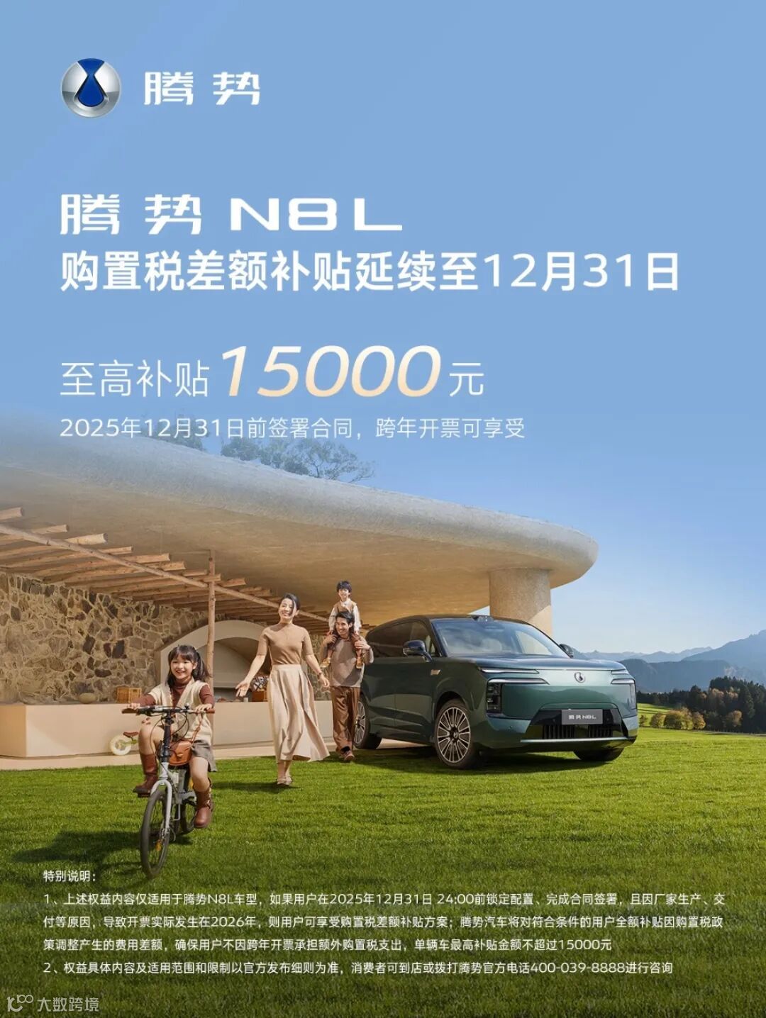 腾势 N8L购置税差额补贴兜底延至 12月31日,至高1.5万元