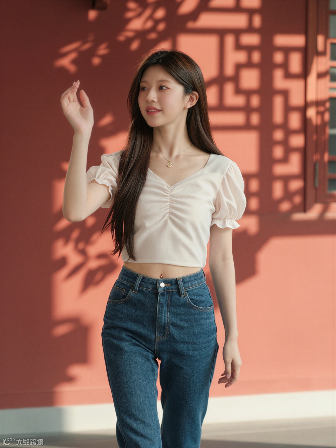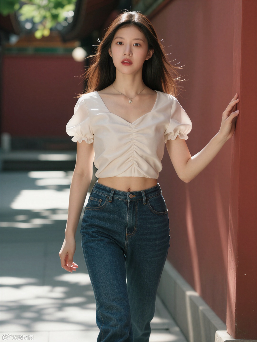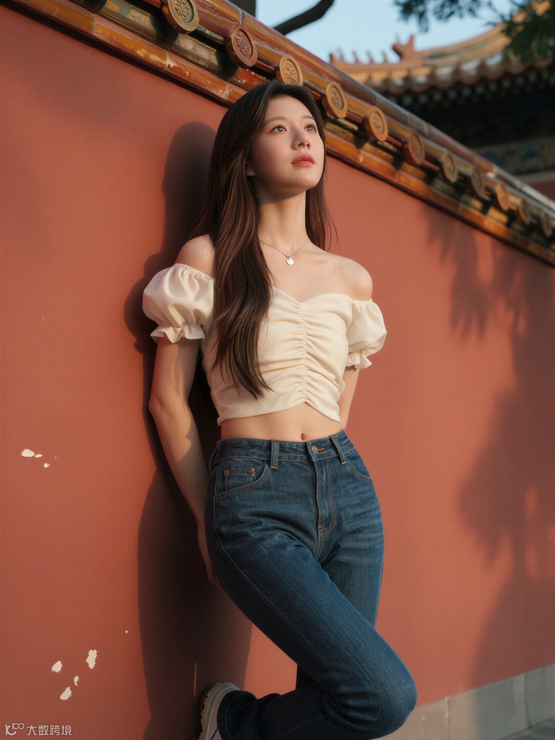 她是闯入六百年宫墙的一个纯白音符。朱红的背景深沉如史书,而她身着的蕾丝边短上衣与修身牛仔裤,则是属于这个时代的轻盈注脚。