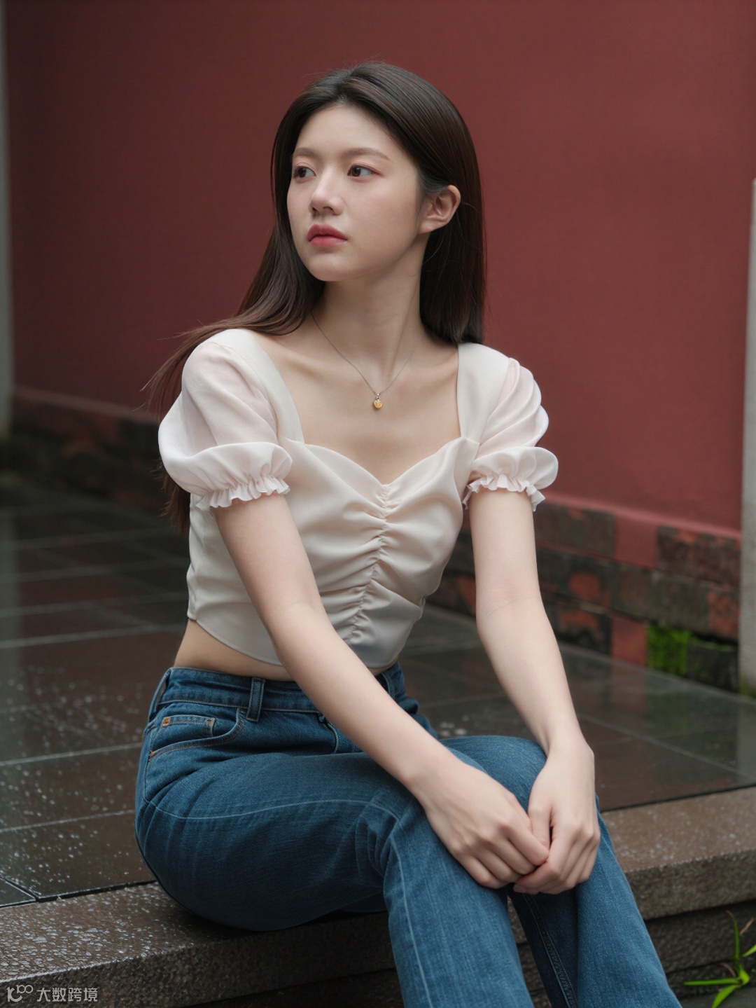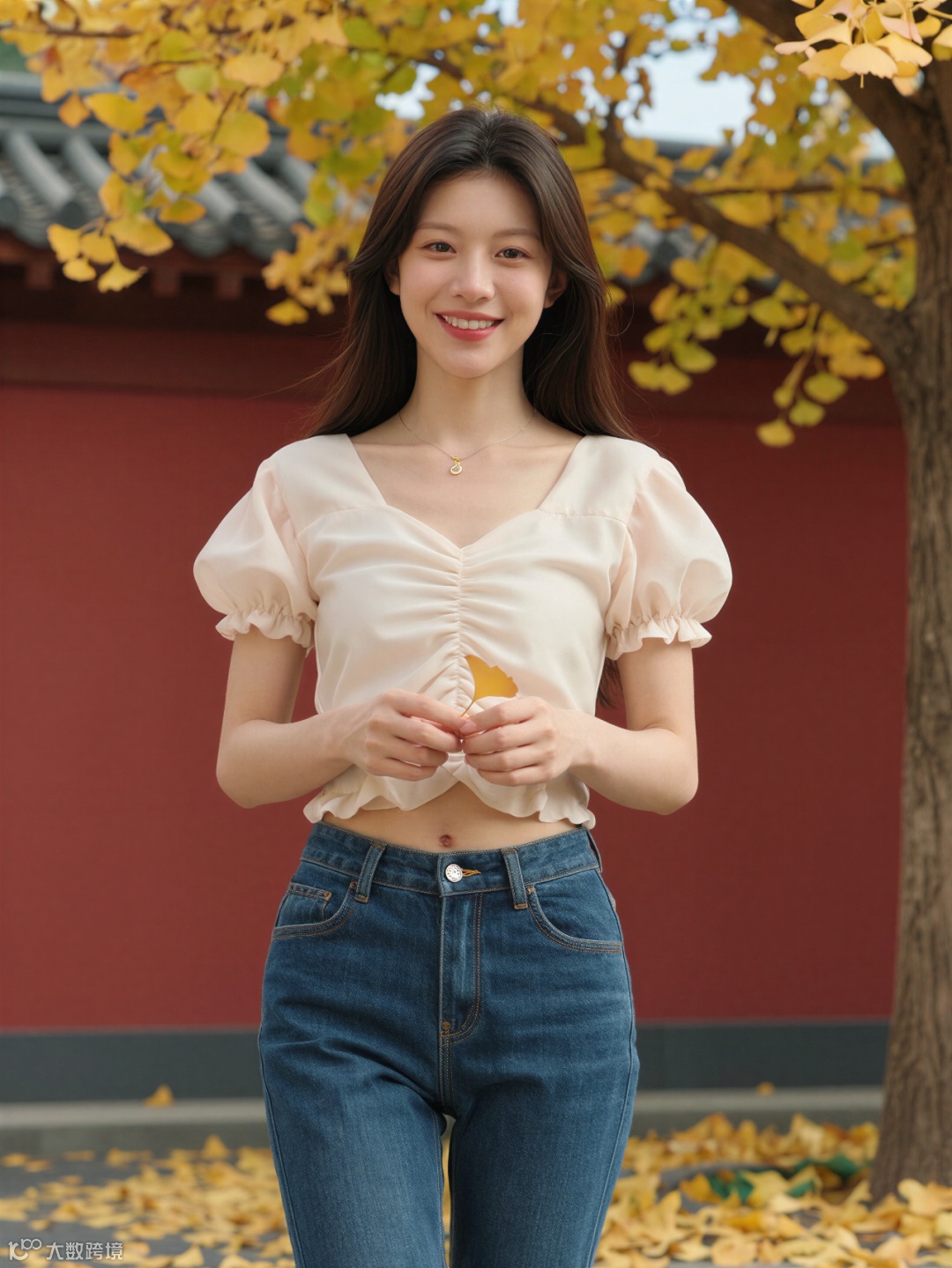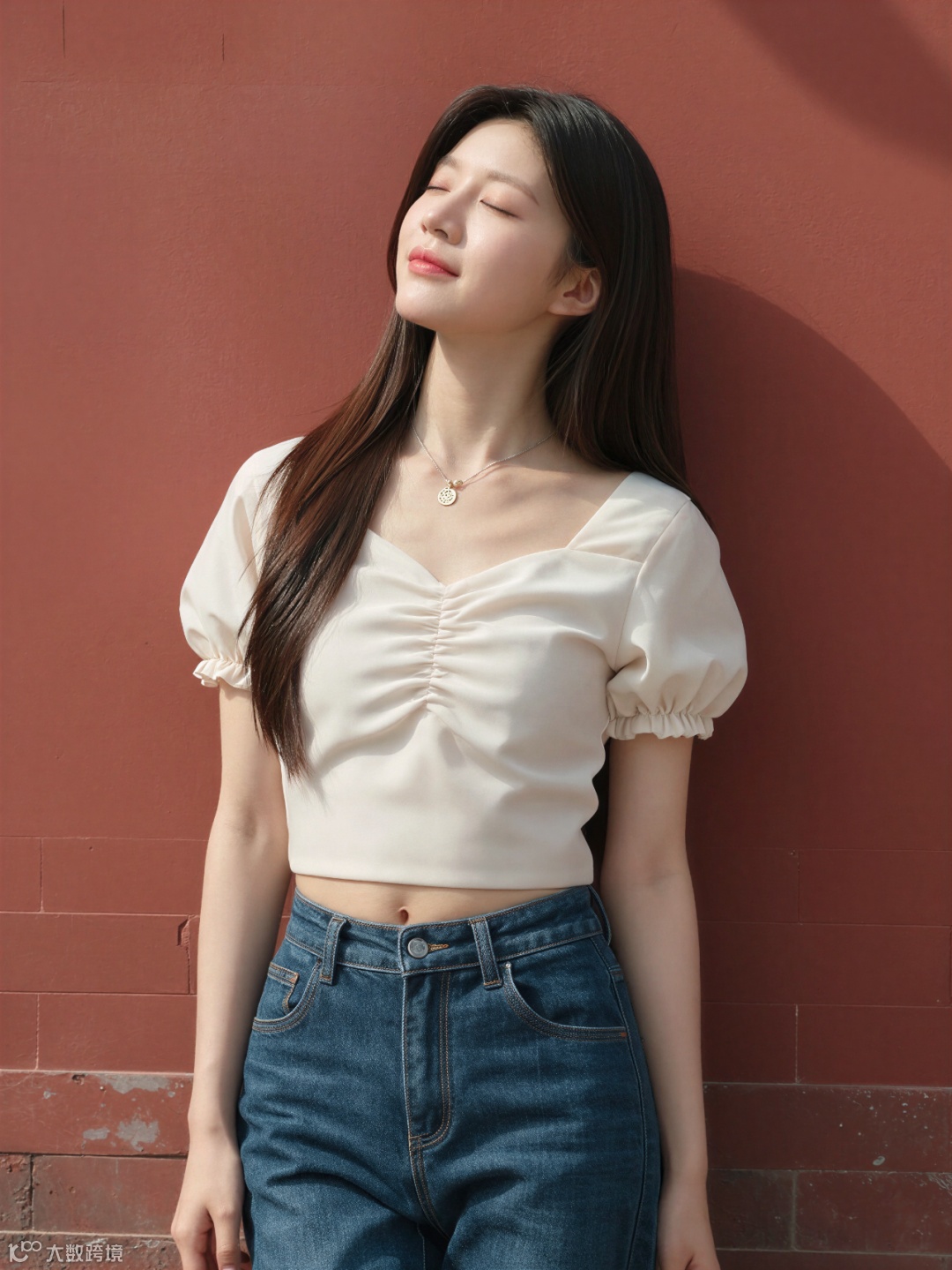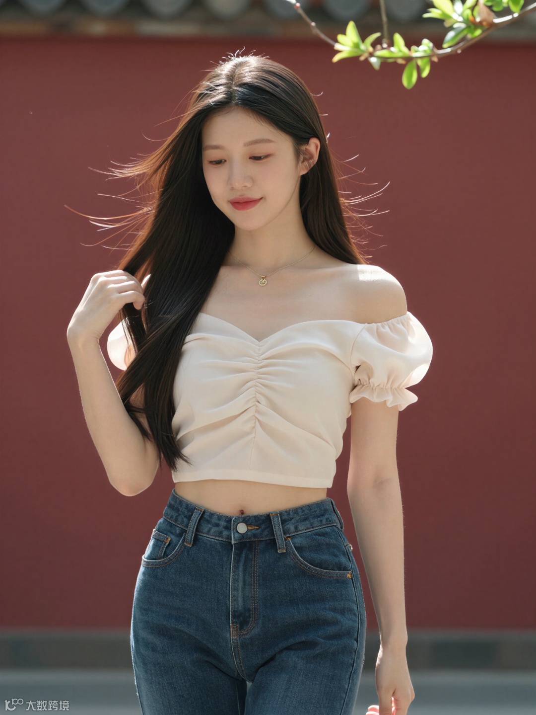 她是闯入六百年宫墙的一个纯白音符。朱红的背景深沉如史书,而她身着的蕾丝边短上衣与修身牛仔裤,则是属于这个时代的轻盈注脚。