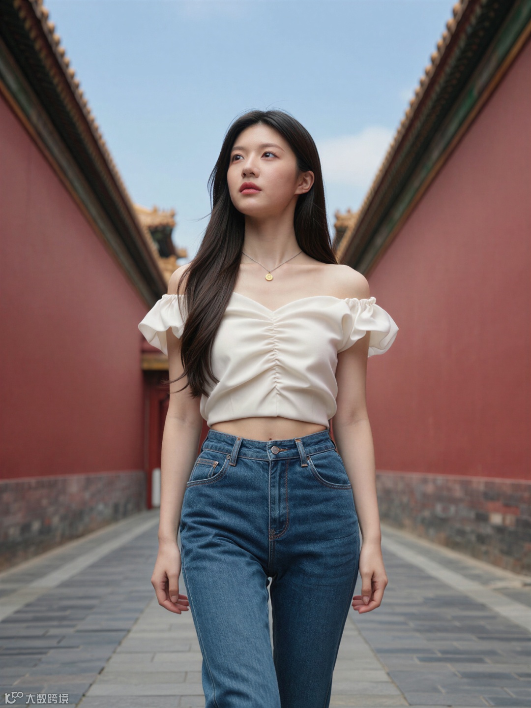 导读:她是闯入六百年宫墙的一个纯白音符。朱红的背景深沉如史书,而她身着的蕾丝边短上衣与修身牛仔裤,则是属于这个时代的轻盈注脚。